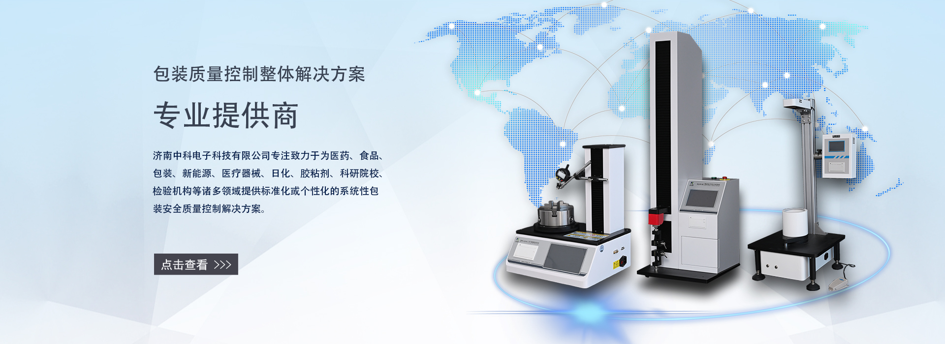 濟(jì)南中科電子科技有限公司是一家集包裝及膜材檢測儀器的研發(fā)、制造、銷售和服務(wù)為一體的專業(yè)科技公司。專注致力于為食品、醫(yī)藥、包裝、新能源、醫(yī)療器械、石化、日化、膠粘劑、科研院校、檢驗機(jī)構(gòu)等諸多領(lǐng)域提供標(biāo)準(zhǔn)化或個性化的系統(tǒng)性包裝及膜材質(zhì)量控制解決方案。